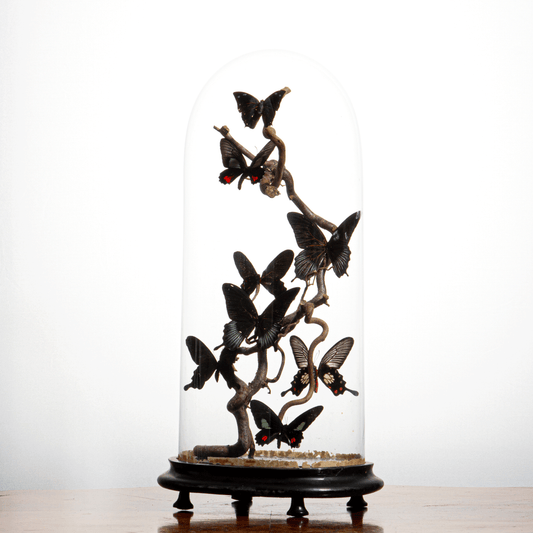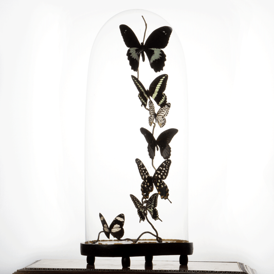 Grote Antieke Stolp met 7 Zwart-Witte Opgezette Vlinders – Luxe Vlinder Woonaccessoires
