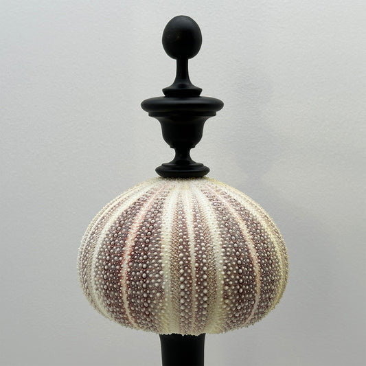 Decoratieve Rode Zee-egel op Koperen Staaf met Zwarte Ovalen Voet – Luxe Ornament