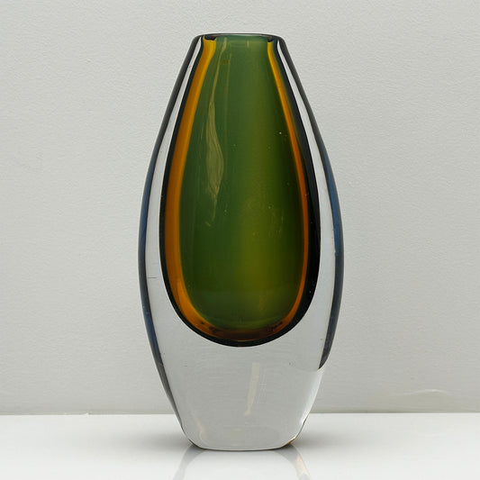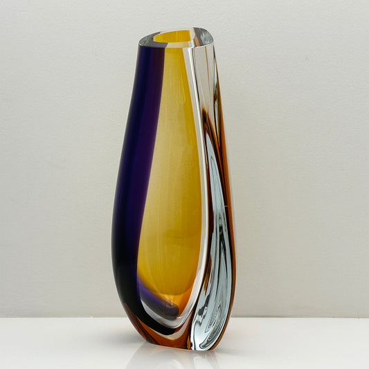Vintage Vicke Lindstrand voor Kosta – Mondgeblazen Sommerso Vaas LH 1842, Blauw-Geel Ingekapseld Glas